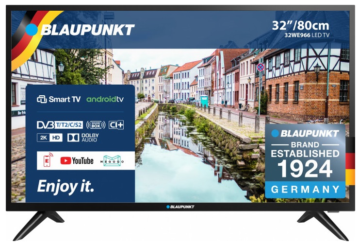Телевизор 32" LED TV Blaupunkt 32WE966, Black (1366x768 HD Ready, SMART TV, 60 Hz, DVB-T/T2/C/S2). (32", Black, 1366x768 HD, SMART TV (Android 8.0 Oreo), APK Installer, Youtube link, IPTV Player, 60Hz, 2 HDMI, 2 USB (foto, audio, video, USB recording), DVB-T/T Диагональ экрана 31.5 " Разрешение (HD) 1366x768 Яркость 300 кд/м2 Контраст 1100:1 Угол обзора 178 ° Время отклика 9.5 мс Цифровое ТВ DVB-T/T2/C/S/S2 Smart TV есть Wi-Fi есть HDMI 2 USB 2 Мощность звука 2x6 Вт Потребляемая мощность 55 Вт/ч Цвет чёрный Размеры настенного крепления VESA 75x75 мм Размеры без подставки 731 х 433 х 68 мм Размеры с подставкой 731 х 486 х 178 мм Вес без подставки 3.82 кг Вес с подставкой 3.9 кг Производитель Blaupunkt