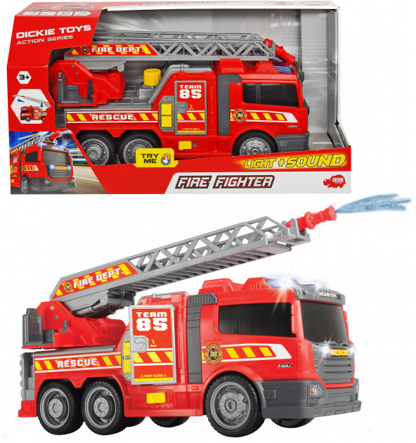 Dickie auto "Pompieri" sunet & lumina 36cm Dickie "Пожарная машина" с водой, свет и звук, свободный ход, 36 см Если ваш малыш больше всего любит играть с машинками, то удивите его новым экземпляром в автоколлекции, который сразу станет ее украшением. Ведь эта пожарная машинка не только выглядит совсем как настоящая, но еще и издает соответствующие звуки, а также оборудована брандспойтом с подачей воды. Размер игрушки: 36 см Питание: 2 батарейки АА (в комплекте) Возраст: от 3 лет