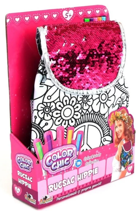 Color Chic - Rucsac Hippie Noriel Color Chic "Рюкзак Xиппи" Персонализируйте свой рюкзак в стиле хиппи, раскрасив его 5 включенными маркерами, и наденьте его в своем уникальном стиле! Содержыт: - рюкзак с пайетками - 5 цветных маркеров Размеры: 47 x 25 см Рекомендуемый возраст: 5 лет +