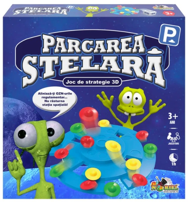 NORIEL GAMES - PARCAREA STELARA Noriel Стратегическая игра "Звездная парковка" Попробуйте выровнять 3 свои пешки, не переворачивая диск. Но будьте очень осторожны ... противник попытается вас остановить. Выигрывает тот, кто сформирует наибольшее количество линий из 3 пешек. Припаркуйте свой НЛО, не переворачивая космическую станцию! В комплекте: - 1 кубик - 1 сборочная площадка, состоящая из 2-х частей, имеющих 4 уровня с позициями для пешек - 2 х опоры для нижней площадки - 48 х пешек (12 пешек по 4 цвета каждая) - регулирование количество игроков: 2-4 Рекомендуемый возраст: 3 года +