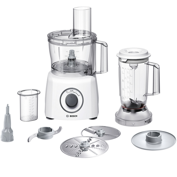 Кухонный комбайн Bosch MCM3200W мощность: 800 Вт объем чаши: 2.3 л блендер, терка, насадка для взбивания, универсальный нож корпус из пластика компактное хранение насадок