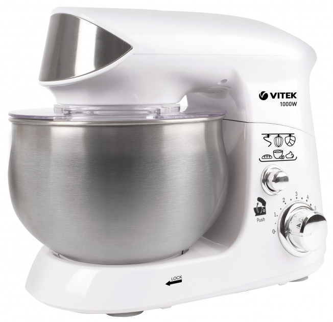 Миксер Vitek VT-1444 Материал корпуса Пластик Тип Планетарный миксер Мощность двигателя 1000 Вт Количество скоростей 6 Габариты (ВхШхГ) 26 х 36 х 22 смМиксер Vitek VT-1444