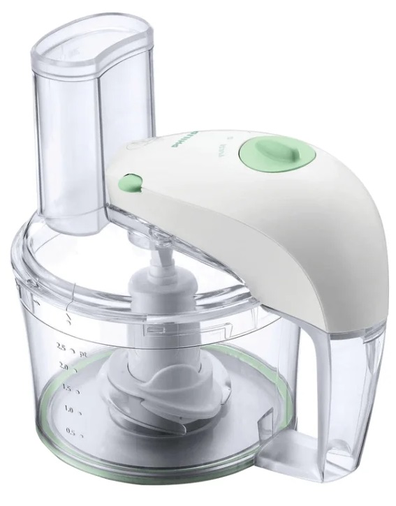 Food processor PHILIPS HR7605/10, 350W power output, bowl 2,1l, whisk. cutting disc, rasping disc, grater disc, white мощность: 350 Вт объем чаши: 2.1 л диск для шинковки, эмульсионная насадка, терка, универсальный нож корпус из пластика компактное хранение насадок