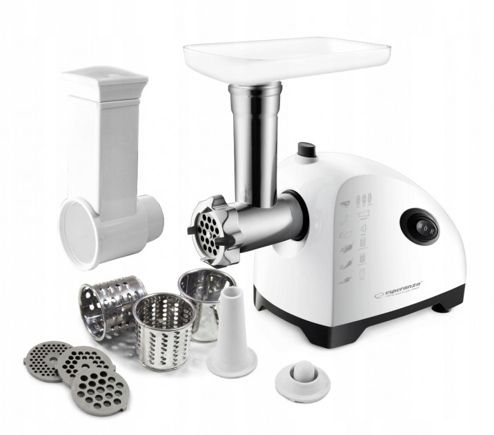 Meat Grinder Esperanza RISSOLE EKM022 800W, stainless steel knife for long time use, metal spiral drive, 3 discs with different diameter holes (2,7mm, 4mm, 8mm), vegetable graters, forward and reverse function; nozzle for making sausages; nozzle for making kebbe Номинальная мощность 600 Вт Цвет Белый Материал корпуса Пластик Решетки 3 Страна производитель Польша