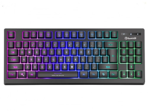 Marvo Keyboard K659 Wired Gaming US LED Rainbow игровая клавиатура с подсветкой без цифровой блокировки компактные размеры с тонкой рамкой мембранные контакты, высокопрофильные клавиши поддержка 25 клавиш с защитой от ореолов радужная подсветка с 3 смешанными цветами мультимедийные функции функция блокировки клавиш Windows прочная и качественная конструкция Количество клавиш: 87 Контакты: мембранные Ход клавиш: 3,6 ± 0,3 мм Надежность клавиш: 10 миллионов нажатий Рабочее усилие: 50 ± 7 г Освещение: Радуга Подключение: USB 2.0 (проводной, 1,7 м) Совместимость: Windows (7 или новее)