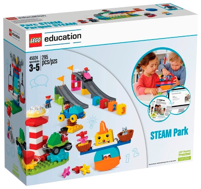 LEGO STEAM Park 45024 для девочки, для мальчика от 3 до 5 лет навыки: логика и мышление, коммуникативные навыки, социально-эмоциональные навыки, счет и математика, интерес к наукам, моторика и ловкость, творческое мышление пластик число деталей: 295 шт. в комплекте: учебно-методический комплекс вес: 5750 г