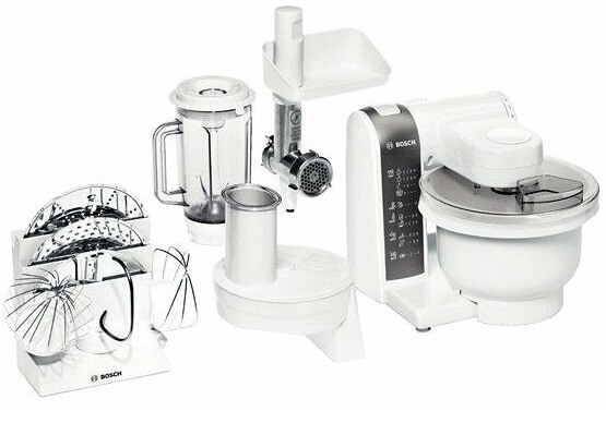 кухонный комбайн BOSCH MUM 4855 мощность: 600 Вт объем чаши: 3.9 л блендер, мясорубка, терка, насадка для взбивания корпус из пластика компактное хранение насадок
