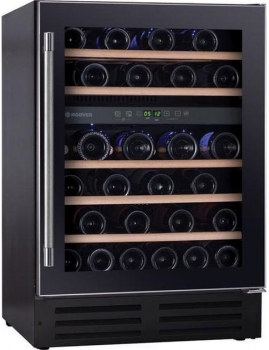 Винный шкаф HOOVER HWCB 60 Объём 0.75 л (bordeaux bottles) 46 Тип управления Цифровой Подсветка LED Технология Fan Оборудование увлажнения 50-80% Рама Да Тип стекла Anti UV Handle material Нержавеющая сталь Материал панели Пластик Цвет корпуса Черный Дверная петля Правые петли Диапазон температур (зона 1): 5 - 22 °C, Уровень шума: 47 dB. Количество полок 5+5 Материал полок Дерево