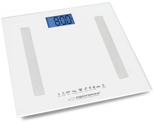 Bluetooth Scale Esperanza 8in1 EBS016W White, measurement: body weight [kg], body fat content [%], water content in the body [%], muscle weight [kg], bone weight [kg], visceral fat index, body mass index (BMI), identification of the optimal calorie inta