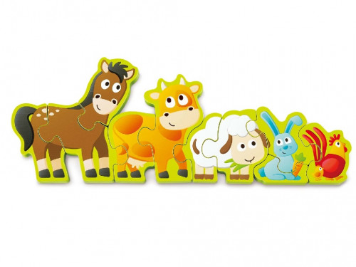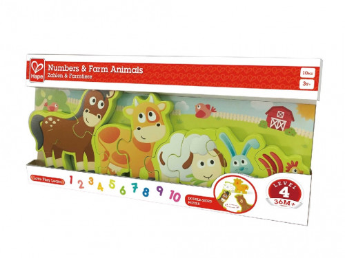 HAPE-NUMBERS&FARM ANIMALS E1628A Красиво созданная деревянная головоломка из 10 частей с сельскохозяйственными животными на одной стороне и числами от 1 до 10 - на другой. Головоломка стоит на столе вертикально.
