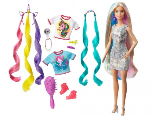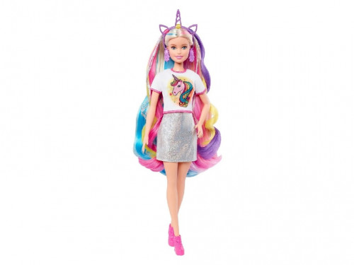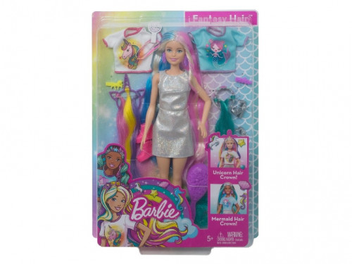Barbie Imagini Fantastice GHN04 Единорог или русалочка? Кукле Барби с радужными волосами не нужно выбирать, ведь она может предстать в каждом из этих чудесных образов. Сделать из Барби русалочку или единорога - это так легко! Для создания нужного образа выберите ободок с разноцветными прядями, топ с тематическим принтом и аксессуары. Яркие локоны на ободке добавят новые цвета в роскошные волосы Барби! Маленькие стилисты могут использовать щетку, резинки и заколки, чтобы сделать кукле неповторимую прическу. Эта сказочная Барби способна подарить счастливую улыбку любой девочке!