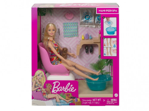 Barbie Spa Salon set GHN07 С этим великолепным игровым набором для маникюра и педикюра кукла Барби готова научить тебя, как правильно ухаживать за собой. Погрузись в мир красоты и здоровья вместе с Барби и ее очаровательным щенком! Наряди куклу в пеньюар, усади поудобнее в кресло и помести ее ноги в ванночку с водой. Добавь в воду специальный порошок и наблюдай, как он пенится. Это же настоящий SPA-массаж для ног! После процедуры вытри ноги Барби, смочи губку холодной водой и прикоснись к ее ноготкам на руках и ногах - они изменят цвет! Придумывай и разыгрывай самые разные бьюти-истории, в этом тебе помогут аксессуары из набора. Не ограничивай свою фантазию, ведь с Барби ты можешь быть кем захочешь! Особенности Наряд куклы Барби - сланцы и пеньюар - отлично подходит для SPA-процедур Подвижные суставы на коленях позволяют сгибать ноги куклы Заполни ванночку для ног водой и добавь в нее специальный порошок, который начнет пениться, имитируя SPA-процедуру Ноготки куклы Барби на руках и ногах меняют цвет, если прикоснуться к ним влажной губкой. Чередуй теплую и холодную воду, чтобы играть снова и снова! Аксессуары включают инструменты для маникюра и педикюра, скамейку-подставку, стилизованную “под дерево” Игры Барби развивают воображение, творческие способности, а также формируют коммуникативные навыки ребенка В комплекте 1 кукла, 1 фигурка, 2 упаковки порошка для SPA-ухода, аксессуары