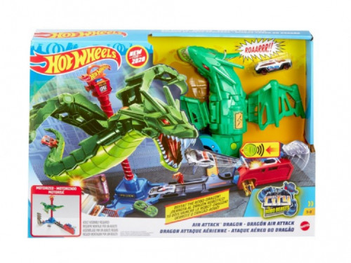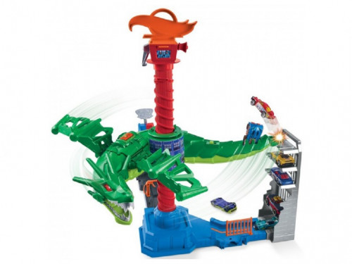 HW Pista Atacul Dragonului GJL13 Не дай Рободракону освободить преступников из тюрьмы и захватить полицейский участок! Для начала игры активируй Рободракона нажатием кнопки на башне. Как только массивный зверь начинает "кружить", запускай машинки масштаба 1:64, чтобы они приземлялись точно между крыльями чудовища.Времени мало, поэтому торопись, пока летающее существо не достигло своей цели! Если машинка ударит по кнопке на спине дракона вовремя, он упадет, и город снова будет в безопасности. По мере того, как чудовище опускается, активируются звуковые эффекты, которые добавляют игре еще больше впечатляющих моментов.