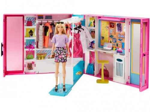 Barbie Garderoba de Vis cu Papusa GBK10 Вместительный шкаф для нарядов – это мечта настоящей модницы! Откройте створки шкафа “Гардероб мечты”, и вы получите великолепное игровое пространство для модных перевоплощений куклы Барби. Комбинируйте наряды и аксессуары, создавайте образы и придумывайте истории с переодеваниями! Кукла не может стоять самостоятельно. Цвета и элементы декора могут отличаться. Шкаф Барби вмещает игровое пространство длинной 60 см, по высоте 12 см, с 10+ отделениями для хранения, вращающейся вешалкой, зеркалом, рабочим местом и более чем 25 нарядами и аксессуарами У куклы Барби 4 наряда - вечернее платье, юбка с рубашкой, костюм педиатра с белым халатом, и гидрокостюм Используйте вращающуюся стойку шкафа для хранения и выбора одежды Выбирайте аксессуары из 3 пар обуви, украшений, сумочки, стетоскопа, маски и ластов, и другого Делитесь стильным образом с друзьями, сидя за компьютером. Рабочее место можно украсить стикерами (входят в комплект) В наборе 10 вешалок, полки и ящики, и корзина для одежды Закончив играть, закройте дверцы и возьмите набор с собой куда угодно! Набор Барби “Гардероб мечты” - отличный подарок для детей, которые любят наряжаться! Развивайте творческий потенциал вашего ребенка, стимулируйте формирование его навыков общения и прививайте чувство стиля В комплекте 1 шкаф, 1 кукла, одежда, аксессуары Для детей от 3 лет Содержит мелкие детали, не для детей до 3 лет