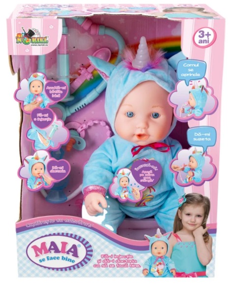 PAPUSA MAIA SE FACE BINE Papusa bebelus "Maia se face buine" Maia a adormit si viseaza ca e unicorn! Are un corn luminos si plange cu lacrimi adevarate: Scoate-i cornul si toarna putina apa in locasul lui, apoi fixeaza cornul la loc. Cand e bolnavioara, fa-i injectie si da-i doctoria ca sa se faca bine. Accesorii medicale si de ingrijire: stetoscop, seringa, lingurita, suzeta Necesita 3 baterii tip AA de 1,5V (incluse) Recomandare: 3 ani + Кукла "Майя выздоравливает" Майя уснула и мечтает, что она единорог! У него яркий рог, и он плачет настоящими слезами: выньте его рог и налейте немного воды на его место, затем закрепите рог обратно. Когда она заболеет, сделайте ей укол и обратитесь к врачу, чтобы она выздоровела. Медицинские и медицинские принадлежности: стетоскоп, шприц, чайная ложка, соска Требуется 3 батарейки АА 1,5 В (в комплекте) Рекомендация: 3 года +
