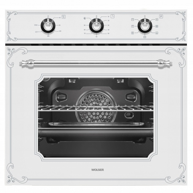 Духовой шкаф Wolser WL- F 66 Rustic White Исполнение: белое стекло Рустик элементы Кол-во функций: 7 Гриль Турбо конвекция Внутреннее покрытие: эмаль легкой очистки Боковые хромированные направляющие Механический таймер 2 противня универсальная решетка