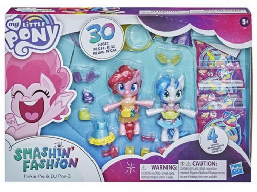 My Little Pony Set Fashion (2) F1286 My Little Pony Set de joc "Smashin' Fashion Party" Acesti ponei se distreaza la maxim! Setul Smashin' Fashion contine figurinele ponei Pinkie Pie si DJ Pon-3 gata sa se lanseze in aventuri intense si pline de trasnai. Poneii vin la pachet cu 20 de accesorii din lumea modei, inclusiv 4 accesorii ascunse pentru tinute! Pune cele 4 pachete Smashin' incluse pe o suprafata plata si zdrobeste-le cu mana pentru a vedea cum se extind si apoi explodeaza! Fiecare punga explodeaza pentru a-ti permite sa descoperi un accesoriu din lumea modei inspirat de personaj si un balon al prieteniei. Imagineaza-ti ca organizezi o petrecere eleganta impreuna cu principalul organizator de petreceri si DJ-ul local din Ponyville. Figurinele Pinkie Pie si DJ Pon-3 sunt insotite de accesorii elegante, precum rochii, pantofi, ochelari de soare si o cordeluta pentru casti. 4 rochii sunt ascunse in interiorul pachetului Smashin’ pentru ca sa te bucuri de o surpriza atunci cand il deschizi! Dimensiune figurina: 8 cm Varsta recomandata: 5 ani + MLP Игровой набор "Пони взрывная вечеринкa" Что может быть лучше вечеринки? Только вечеринка с лучшими друзьями в веселом party bus! Пони-модницы уже нарядились и готовы зажигать и веселиться. В наборе Smashin Fashion представлены позирующие фигурки пони Пинки Пай и Диджей Пон-3, с которыми вы можете разыграть самые дикие и безумные приключения! Положите 4 прилагаемых шарика с сюрпризами на плоскую поверхность и разбейте их рукой, чтобы увидеть, как они расширяются и лопаются! Из нарядов и аксессуаров у фигурок пони есть платья, обувь, солнцезащитные очки и повязка на голову. В комплекте: 2 фигурки, 4 шарика с сюрпризами, 24 аксессуара Высота фигурок: 8 см Рекомендуемый возраст: 5 лет +