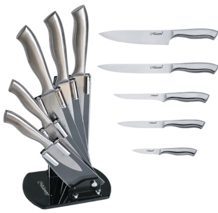 Набор ножей Maestro MR-1410 Высококачественнаянержавеющая сталь Профессиональная заточка Эргономичный дизайн Удобные ручки Полированная поверхность Прекрасная балансировка В набор входит: Поварской нож 8”, Нож универсальный 8”, Нож обвалочный 6”, Нож общего назначения 5”, Нож для чистки овощей 3,5”, Подставка для ножей