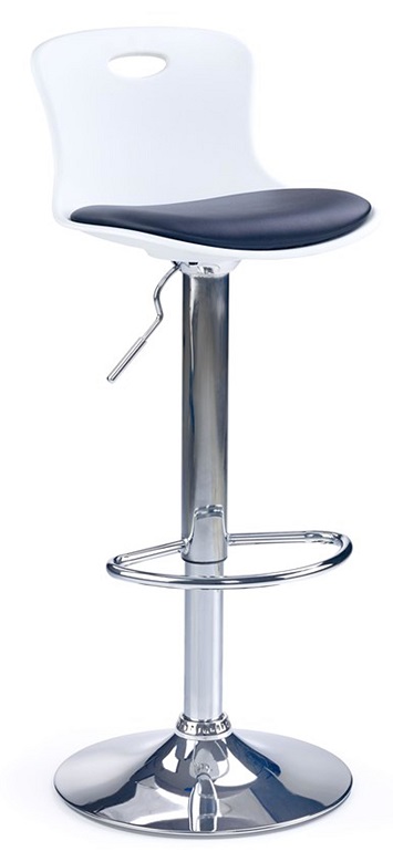 Стул H49 Стул барный H-49 – барный стул со спинкой польской компании Halmar (Халмар) на металлическом каркасе. Устойчивая ножка с круглым основанием и подставкой для ног выполнена из хромированной стали. Удобное сиденье и невысокая спинка оригинального дизайна изготовлены из прочного полипропилена белого цвета. В качестве обивки использована экокожа черного цвета. Высота стула регулируется с помощью газлифта от 80 до 102 см.