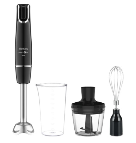 Блендер TEFAL HB943838, 1000W power output, mixing bowl 0.5l, whisk. black Тип: погружной Мощность 1000 Вт Измельчитель есть Объем чаши 0.5 л Материал чаши пластик Импульсный режим есть Венчик для взбивания есть Мерный стаканчик есть Объем мерного стакана 0.8 л Материал корпуса пластик Материал погружной части нержавеющая сталь Цвет чёрный Вес 1.3 кг Страна производства Китай Производитель Tefal