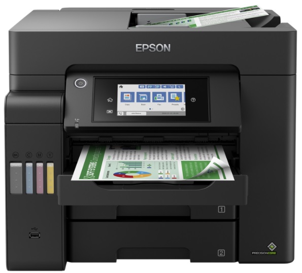 MFD Epson L6550 функционал: принтер, сканер, копир, факс назначение: для небольшого офиса печать: 4-цветная скорость: 32 стр/мин (ч/б A4), 22 стр/мин (цветн. А4) макс. формат печати: A4 (210 х 297 мм) макс. размер отпечатка: 210 х 297 мм печать фотографий: да цветной ЖК-дисплей: да интерфейсы: Wi-Fi, Ethernet (RJ-45), USB