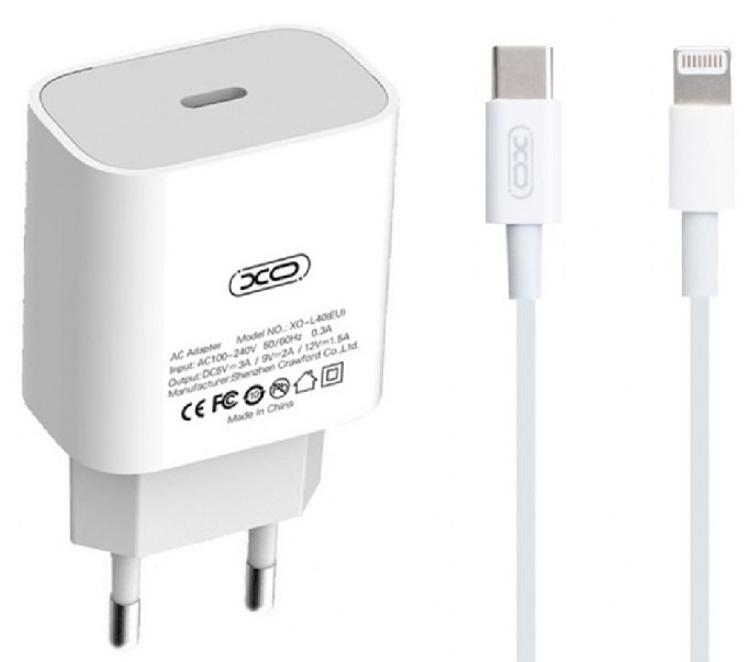 Wall Charger XO + Lightning Cable, PD 18W, L40,White Input : 100-240V ~50/60Hz Max0.6A Output: 5.0V-2.0A Standard USB interface - Plug and use