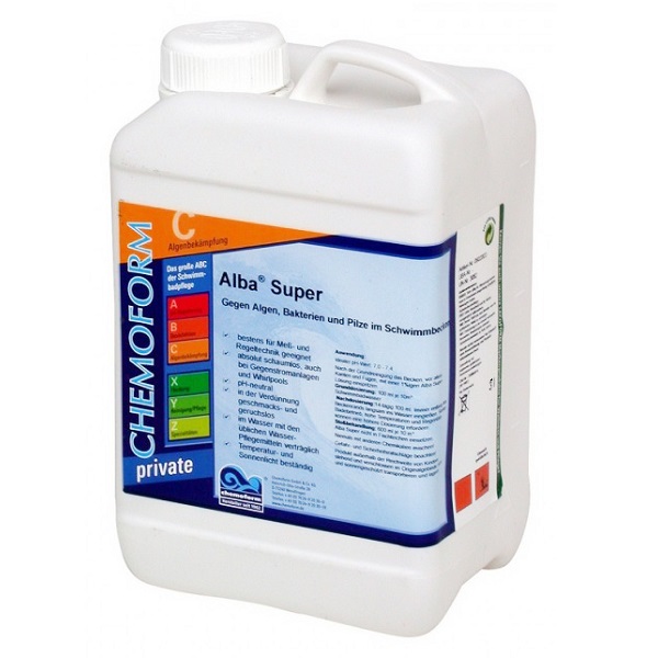 Solutie ALGEZID Alba Supr 5L Борьба с водорослями Если водоросли начали размножаться, на дне и стенках бассейна появляется скользкий налет. По крайней мере, сейчас Вы должны начать что-либо предпринимать, потому что, в обратном случае, через пару дней вода станет зеленой. Кроме того водоросли создают прекрасную питательную среду для бактерий и возбудителей различных болезней. Algicid Альба — рН нейтральный, слегка пенящийся — универсальный, обладает дезинфицирующими свойствами для обработки душевых, дорожек и пола — в бассейне не реагирует с хлорными препаратами — без вкуса и запаха — фасовка: туб 1л, канистра 3, 5, 10 литров Для того чтобы предотвратить появление водорослей, нужно принять меры еще перед заполнением бассейна. Натрите стены и дно 5% раствором средства Algicid и только тогда наполните его водой. Hакрыв бассейн пленкой (т.н. солярной), не пропускающей солнечные лучи, Вы также предотвратите рост водорослей. Основная дозировка: При первичной обработке наполненного бассейна добавьте 100мл препарата на 10м3 воды. Последующая дозировка: По степени загрязнения и погоде – добавлять через каждые 1 — 2 недели 50мл на10м3 объема бассейна. При интенсивном использовании бассейна, высоких температурах и после осадков, дозу следует увеличить на 10-20%. Применение: медленно вливать вдоль стенок бассейна. Можно добавить в скиммер во время фильтрации, чтобы средство быстрее перемешалось.