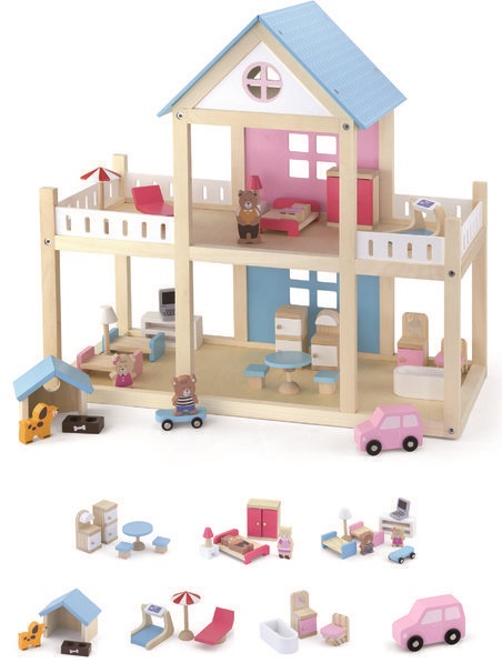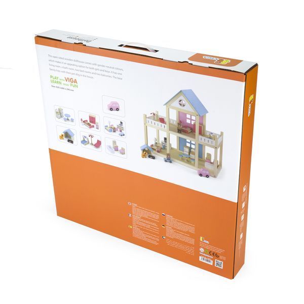 Деревянный кукольный домик Этот деревянный кукольный домик с открытыми сторонами поставляется с нейтральными цветами, что делает его привлекательным вариантом как для девочек, так и для мальчиков. Он имеет одну гостиную, ванную комнату, две спальни и два балкона. Семья медведей живет со своей собакой в доме. Полный набор домашней мебели и бытовой техники, которые легко перемещать и расставлять по своему усмотрению. Идеальный набор для притворной игры с друзьями, помогает развивать социальные способности. Предназначен для развития воображения и критического мышления.