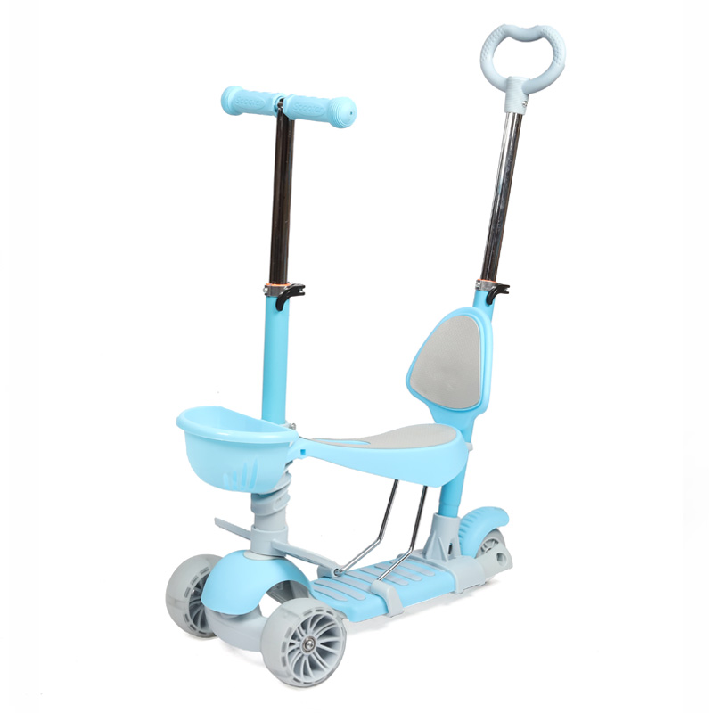 Самокат детский 5в1 (подножка), голубой, код 147605 Использовать детский самокат 5 в 1 во время прогулок очень полезно для развития координации малыша. Подвижные игры и нагрузка на ноги позволяют тренировать все необходимые навыки и учиться удерживать равновесие. Рама и корпус самоката изготовлены из легкого алюминиевого сплава, который максимально облегчает конструкцию, позволяя тем самым ребенку совершать самые разные маневры. Благодаря такой легкой конструкции детский самокат не причинит вреда ребенку даже во время падения. Самокат можно использовать как самокат, беговел, каталку с родительской ручкой, толкалку. Этот детский транспорт имеет дополнительное сиденье, которое можно установить и катать самых маленьких. Передние колеса самоката светятся, выполнены из поливинилхлорида. Оно прочно крепится к раме самоката, используя его, малыш может пользоваться самокатом как беговелом.