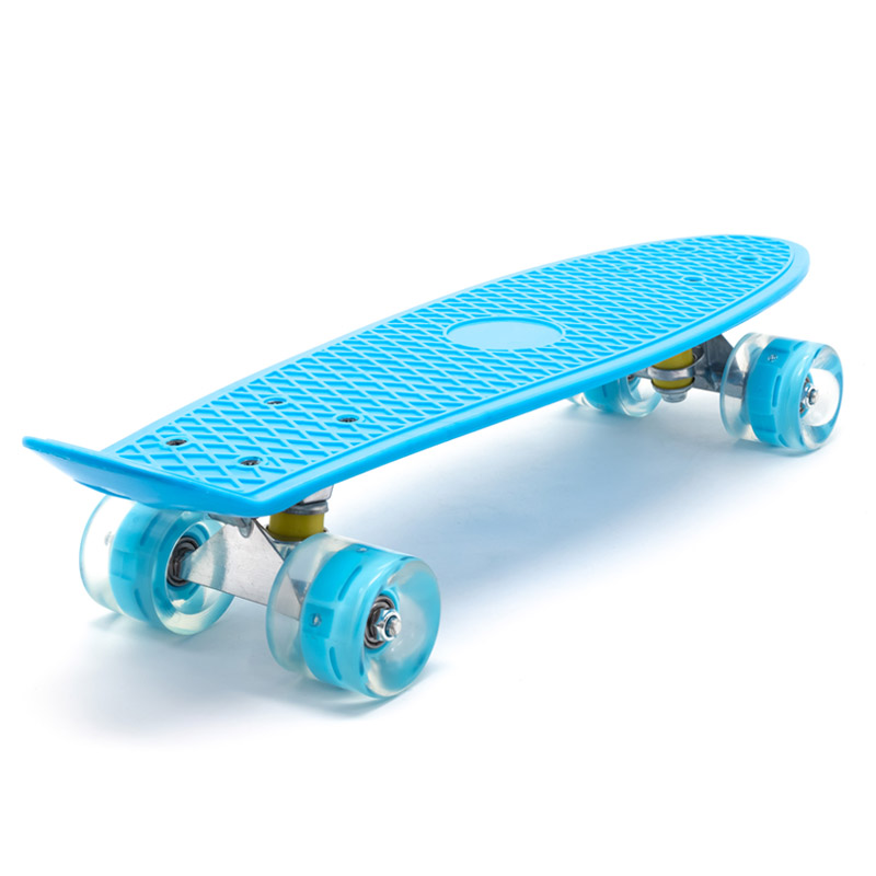Пенни борд со светом(голубой), код 87310 Penny Board представляет собой прекрасное транспортное средство для подвижных и спортивных детей, любящих отдых на свежем воздухе и активные виды развлечений. Благодаря своему маленькому весу и небольшим габаритам, Penny Board прекрасно подойдёт для города и будет удобен в транспортировке. Он прост в управлении, что делает его доступным и безопасным даже для самых маленьких детей! Данная модель самоката отличается прозрачными полиуретановыми колесами с ярким световым эффектом. Бренд: China Возраст: 6+ Размер: 55 см