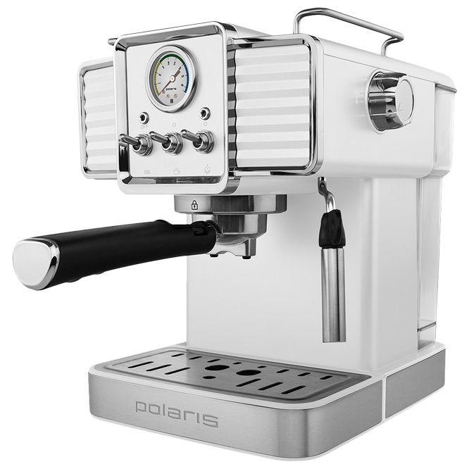 Кофемашина Polaris PCM1538E, Power output 1350W, water tank capacity 1,5L, suitable for coffee powder, pump pressure 15 bar, 2-cup-function, white Бренд: Polaris Максимальное давление: 15 бар Объём резервуара для воды: 1.5 л Приготовление чашек кофе: 1 Тип: Эспрессо Тип кофе: Молотый Энергопотребление: 1350 Вт Тип управления: Механическое