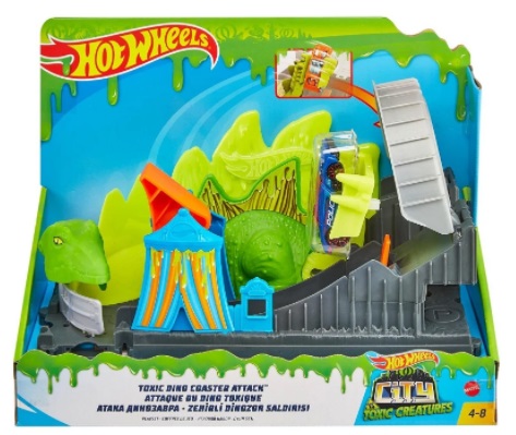 HW Pista Atacul Dinozaurului Virsta: 4+ Pentru: Baie?i Hot Wheels Set "Atacul Dragonului" Setul "Atacul Dragonului" este un joc de noroc, deoarece un stegosaur periculos a preluat roller coaster-ul din Hot Wheels City, creand un obstacol imens! Copiii aduc ma?ini la casa ?i, cu ajutorul unui starter, incep sa alerge intr-un cerc sau direct in gura unui monstru suparat. Lansarea necesita precizie ?i indemanare, deoarece daca nu ape?i pe tragaci cu for?a potrivita, coada dinozaurului va arunca ma?ina de pe pista! Varsta recomandata: 4 ani + Возраст: 4+ Для: Мальчиков Hot Wheels Игровой набор "Американские горки" Набор "Американские горки" Hot Wheels - это рисковое приключение, ведь опасный стегозавр захватил американские горки в городе Hot Wheels, создав огромное препятствие! Дети подвозят машинки к кассе и с помощью пускателя запускают их мчаться по кругу или прямо в пасть разъяренного чудовища. Запуск требует точности и мастерства, потому что если не нажать на пускатель с должной силой, хвост динозавра сбросит машинку с трека! Рекомендуемый возраст: 4 года +