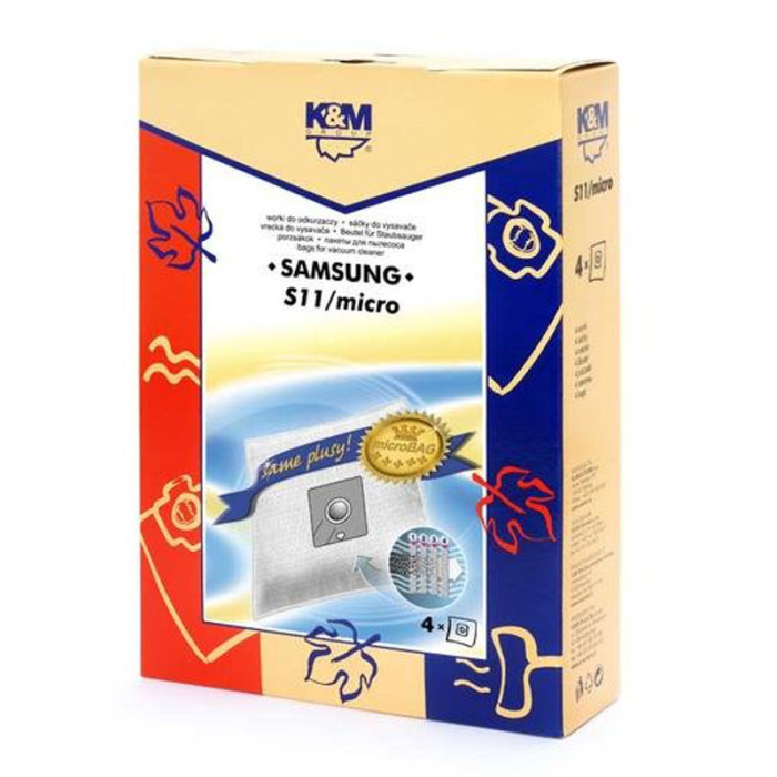 Vacuum Cleaner Bag K&M KM-S11, Suitable for VC Samsung Тип Сменный пылесборник Состав комплекта 4 мешка для сбора пыли Материал пылесборника Синтетика Совместимые модели Универсальный для пылесоса SamsungVacuum Cleaner Bag K&M KM-S11
