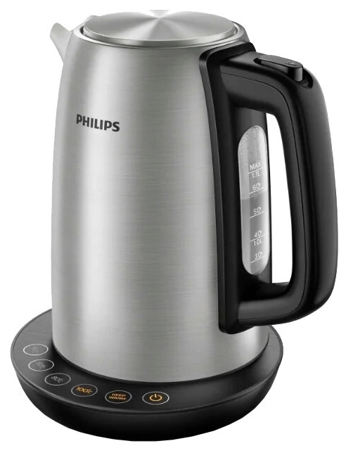 Электрочайник Philips HD9359/90, Stainless steel, 2200W, 1,7l, concealed heating element, 360° swivel base, 40-100°C, inox black объем: 1.7 л материал корпуса: металл мощность: 2200 Вт доп. функции: поддержание тепла безопасность: отключение при снятии с подставки, блокировка включения без воды особенности: вращение на 360 градусов, индикатор уровня воды, фильтр, отсек для хранения шнура тип нагревательного элемента: закрытая спираль возможность выбора температуры: есть подсветка корпуса: есть вес: 1.33 кг