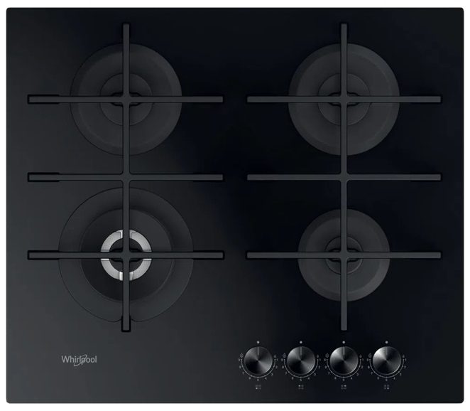 Варочная панель Whirlpool GOWL 628/NB материал панели: закаленное стекло количество конфорок: 4 установка: независимая электроподжиг: есть газ-контроль: есть чугунные решетки: есть переключатели: поворотные ШхГ: 59х51 см
