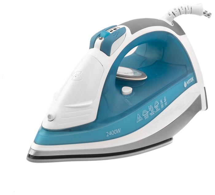 Утюг VITEK VT-1264, 2400W, ceramic solitplace, 350 ml water tank capacity, steam 130/40 g/min. white blue мощность: 2400 Вт материал подошвы: керамика паровой удар: 135 г/мин вертикальное отпаривание функция разбрызгивания противокапельная система вес: 1.06 кг