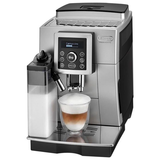 Coffee Machine DeLonghi ECAM23.460SB Бренд: Delonghi Ёмкость контейнера для зёрен: 250 г Индикация уровня воды: Да Капучинатор: Автоматический Количество степеней помола: 13 Контейнер для молока: Да Максимальное давление: 15 бар Мощность: 1450 Вт Объём резервуара для воды: 1.8 л Регулировка по высоте дозатора кофе: Да Съёмный лоток для сбора капель: Да Тип: Автоматическая Тип кофе: В зёрнах, молотый Тип нагревателя: Бойлер Функция памяти: Да Вместимость контейнера для отходов: 14 порций Вес: 9 кг Подача горячей воды: Да Подогрев чашек: Да Приготовление двух чашек: Да Программы для очистки: Да Регулировка крепости кофе: Да Регулировка порции горячей воды: Да Регулировка температуры кофе: Да Наличие дисплея: Да Материал корпуса: Пластик Размеры: 43 x 34 x 23,8 см Цвет: Черный Оттенок: Silver