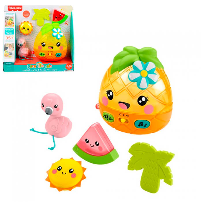 FP Ananasul muzical si prietenii sai Virsta: 0 - 3 ani Pentru: Ambisex FP Jucarie "Ananasul muzical ?i prietenii sai" (eng) Jucaria reproduce peste 35 de cantece, sunete, melodii ?i fraze in limba engleza. Punand prieteni tropicali in ananasul jucau?, copilul va auzi sunete amuzante ?i melodii incantatoare ?i va vedea lumini stralucitoare. Vrei mai multa distrac?ie? Apasa?i butoanele de pe ananas pentru a auzi mai multa muzica tropicala ?i pentru a activa melodii ?i fraze de inva?are despre culori, numere ?i forme. Setul include trei zornaitoare: sub forma de soare, o bucata de pepene verde ?i un flamingo cu picioare moi din dantela. Varsta recomandata: de la 6 luni Возраст: 0 - 3 года Для: Всех FP Музыкальный игровой набор "Ананас и друзья" (англ.) Игрушка воспроизводит более 35 песен, звуков, мелодий и фраз на английском языке. Поместив тропических друзей в шаткий ананас, ребенок услышит веселые звуки и задорные мелодии, и увидит яркие огоньки. Хотите еще веселья? Нажимайте кнопки на ананасе, чтобы услышать больше тропической музыки, а также активировать песни и учебные фразы о цветах, цифрах и фигурах. Дети могут хватать, трясти и исследовать игрушки, а также прокручивать красочный цветок на голове оранжевого красавчика. В набор входят три погремушки: в виде солнышка, кусочка арбуза и фламинго с мягкими ножками-шнурочками, а также пальма-прорезыватель. Рекомендуемый возраст: от 6 месяцев