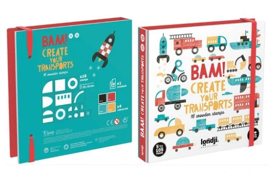 Londji Activities - Bam! Transports BAM Transport Stamps позволяет создавать свои собственный транспорт! Машины, самолеты, ракеты, поезда - на все, на что хватит вашего воображения! 16 деревянных штампов, 4 краски и блокнот для творчества. Все упаковано в красиво иллюстрированную коробку с эластичной застежкой для поддержания порядка.