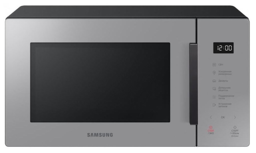 Microwave Oven Samsung MS23T5018AG/BW, 23l, 800W, electronic control, 5 power levels, 28.8 cm rotating plate, defrost function,interior lighting, black glass Объём камеры, л 23 Диаметр поворотного стола, см 28 Внутреннее покрытие биокерамика Тип открывания дверцы ручка Производитель Samsung Модель MS23T5018AG/BW Мощность микроволн, Вт 1150 Тип управления сенсорный Дисплей да Часы да Потребляемая мощность , Вт 2300 Высота, см 27.5 Ширина, см 48.9 Глубина, см 36.3 Цвет серый
