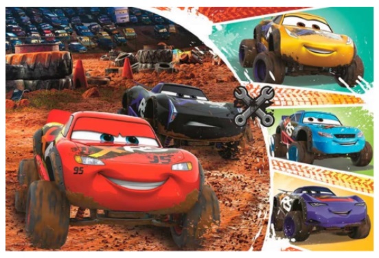 Trefl Puzzles - 60 - Lightning McQueen with friends Пазлы на 60 элементов с изображением в виде коллажа Молнии Маккуин и его друзей - любимых персонажей популярного анимационного фильма Уолта Диснея "Тачки-3". В сложенном виде размер картинки составляет 22х33 см. Высокое качество, насыщенность цветов и безопасность при собирании пазлов обеспечивает специальный каландрированный картон, который отражает свет и покрыт экологическими красками.