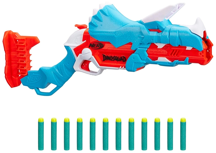 NER TRICERABLAST Возраст: 8+ Для: Мальчиков Hasbro Nerf Бластер "Дино Трицерабласт" Откройте бластер Нёрф Диносквад Трицера, надавив на рог, расположенный на голове динозавра, чтобы опустить ствол, и открыть камеру для стрел. Загрузите 3 стрелы и закройте ствол. Спустите курок, чтобы зарядить бластер, затем нажмите на спусковой крючок, чтобы выстрелить 1 стрелу в цель. У этого бластера предусмотрено встроенное хранилище для 12 стрел, чтобы резервные стрелы всегда были под рукой, и вы могли быстро перезагрузить бластер, и продолжить игру. Рекомендуется надевать очки (не входят в комплект). Батарейки не требуются. В комплекте: бластер, 12 стрел и инструкции. Рекомендуемый возраст: 8 лет + Virsta: 8+ Pentru: Baie?i Nerf Blaster "Dino Tricerablast" Valorificati forta extraordinara a celor mai mari dinozauri dintre toti si lansati-va in aventuri uimitoare! Incarcati-va in actiune cu trei darts cu blasterul Nerf DinoSquad Tricera-blast! Blasterul are incarcare deschisa si o modalitate distractiva de a-l deschide. Impingeti claxonul din fata pe capul dinoului, iar teava se balanseaza in jos pentru a dezvalui camera de sageti din interior. Incarcati 3 sageti si inchideti teava. Trageti in jos ciocanul pentru a amorsa blasterul, apoi apasati pe tragaci pentru a trimite 1 sageata zburand catre tinta dvs. Include 12 sageti oficiale din spuma Nerf Elite care sunt testate si aprobate pentru performanta si calitate. Nu sunt necesare baterii. Include: blaster, 12 sageti si instructiuni. Varsta recomandata: 8 ani +