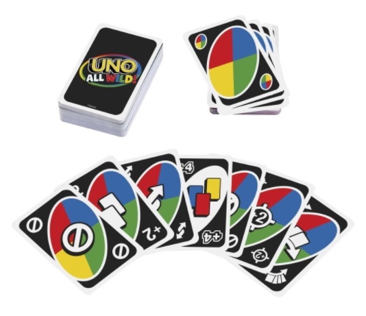 UNO ALL WILD Вид карты , Uno Для взрослых да Для детей да Возраст от 7 лет Количество игроков 2-10 Размеры 14,6x9,3x2 cm Комплектация 112 карт , инструкция Вес 159 гр Материал картон Производитель Mattel