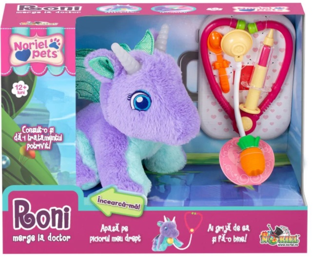 Noriel Pets - Dragonul Roni Возраст: 1+ Для: Всех Noriel Pets Интерактивная игрушка "Дракон Рони" Рони - очень веселый дракон; он любит летать над облаками и развлекать детей выдуванием искр. Однако сейчас он чувствует себя плохо и нуждается в вашей помощи! Слушайте его сердце, сделайте ему укол, когда это необходимо, и убедитесь, что он ест свою морковь. Рони издает звуки, когда вы нажимаете на его правую лапу, когда вы кладете стетоскоп ему на грудь, когда вы кладете ему в рот чайную ложку или морковку и когда вы подносите шприц ближе к месту, отмеченному для инъекции. Содержит: 1 дракон, 1 шприц, 1 стетоскоп, 1 морковь, 1 чайную ложку лекарства. Работает от 3-х батареек ААА 1,5 В (входят в комплект). Рекомендуемый возраст: 12 месяцев + Virsta: 1+ Pentru: Ambisex Noriel Pets Jucarie interativa "Dragonul Roni" Roni este un dragon tare vesel; ii place sa zboare deasupra norilor si sa ii distreze pe copii sufland scantei. Acum, insa, nu se simte foarte bine si are nevoie de ajutorul tau! Asculta-i inima, da-i doctoria, fa-i o injectie la nevoie si asigura-te ca-si mananca morcovii. Ea se va insanatosi cat ai clipi, va incepe sa cante si sa lumineze in culori! Roni emite sunete atunci cand ii apesi labuta dreapta, cand ii pui stetoscopul pe piept, cand ii duci lingurita sau morcovul la gura si cand apropii seringa de locul marcat pentru injectie. Contine: 1 dragon, 1 seringa, 1 stetoscop, 1 morcov, 1 lingurita medicament. Functioneaza cu 3 baterii tip AAA de 1,5V (incluse). Varsta recomandata: 12 luni +