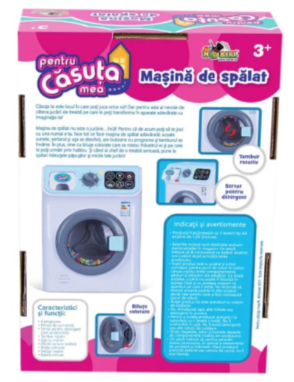 Casuta Mea - Masina de Spalat Virsta: 3+ Pentru: Ambisex Casuta Mea "Masina de Spalat" Masina de spalat scoate sunete, sertarul si usa se deschid, are butoane cu programe si tamburul se invarte. In plus, vine cu bilute colorate care se rotesc inauntrul ei si pe care le poti urmari prin hublou. Si cand ai chef de o treaba serioasa, pune la spalat hainutele papusilor si micile tale jucarii! Caracteristici si functii: - 4 programe - Panou de comanda - Sertar pentru detergent care se deschide - Tambur rotativ - Usa cu maner - Efecte sonore realiste - Bilute colorate - Design realist - Baterii incluse Functioneaza cu 3 baterii tip AA de 1.5V (incluse). Varsta recomandata: 3 ani + Возраст: 3+ Для: Всех Noriel Мой дом "Cтиральная Mашина" Стиральная машина шумит, ящик и дверца открываются, есть кнопки программ и крутится барабан. Кроме того, он поставляется с разноцветными шариками, которые вращаются внутри него, и вы можете следить за ними через окно. А когда вам захочется серьезной работы, постирайте одежду своих кукол и свои маленькие игрушки! Особенности и функции: - 4 программы - Панель управления - Ящик для моющих средств, который открывается - Вращающийся барабан - Дверь с ручкой - Реалистичные звуковые эффекты - Цветные шары - Реалистичный дизайн - Батарейки в комплекте Работает от 3 батареек АА 1,5 В (входят в комплект). Рекомендуемый возраст: 3 года +