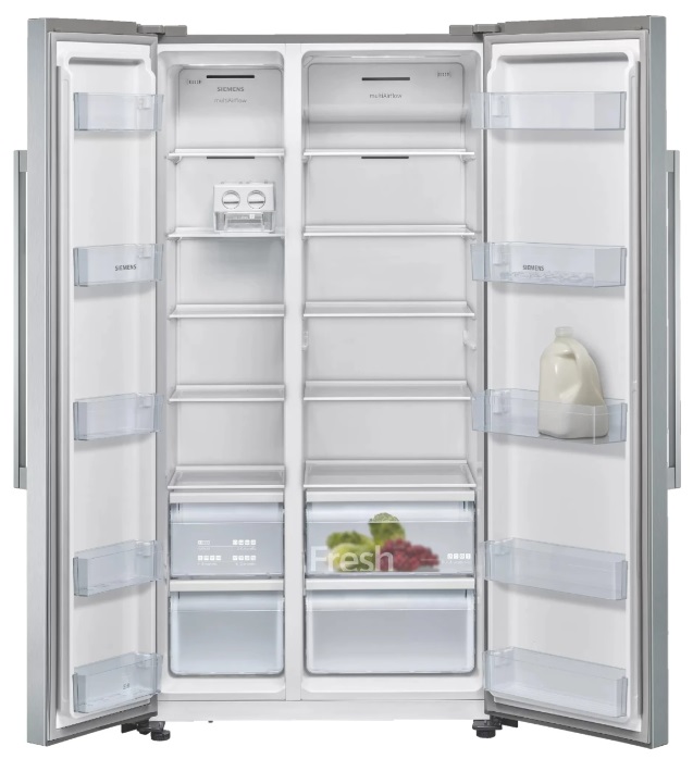 SIEMENS KA93NVIFP Тип Side-by-Side Расположение морозильной камеры сбоку Тип управления электронное Дисплей да Общий полезный объем 580 л Объем холодильного отделения 372 л Объем морозильного отделения 208 л Зона свежести да Диспенсер нет Размораживание холодильной камеры No Frost Размораживание морозильной камеры No Frost Материал полок стекло Количество полок 10 Ящик для овощей и фруктов 2 Количество отделений в морозилке 7 Количество компрессоров 1 Класс энергоэффективности 03/2021 F Энергопотребление в год 413 кВтч Мощность замораживания 12 кг/cутки Автономное сохранение холода 8 ч Супер охлаждение да Суперзаморозка да Уровень шума 42 Дб Ручки барные Сигнaлизaция открытой двeрцы да Климатический класс SN-T Высота 178.7 см Ширина 90.8 см Глубина 70.7 см Цвет нерж. сталь Вес 100 кг Производитель Siemens
