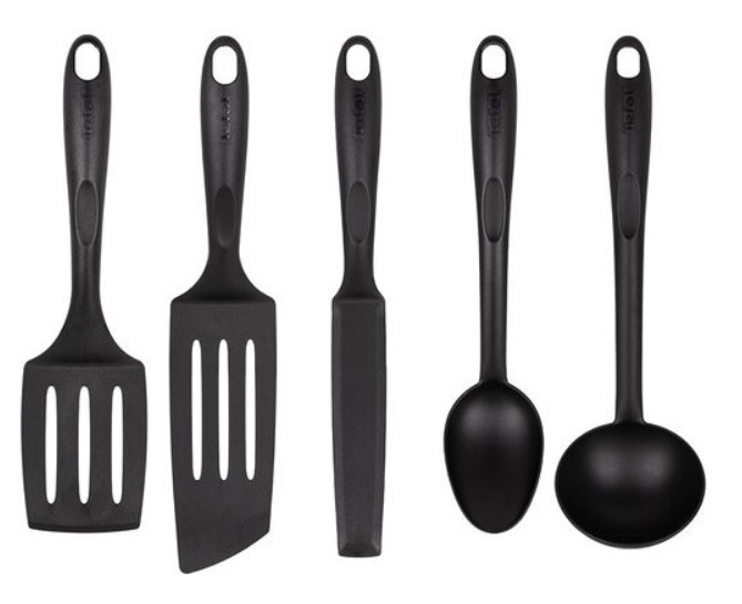TEFAL K001A504 Материал нейлон Количество предметов 5 Материал ручек нейлон Ложка сервировочная да Лопатка да Лопатка с прорезями да Половник да Ocoбенности Ложка - 305мм , половник - 315мм , лопатка для блинов - 320мм , длинная лопатка - 305мм , угловая лопатка - 330 мм Производитель Tefal