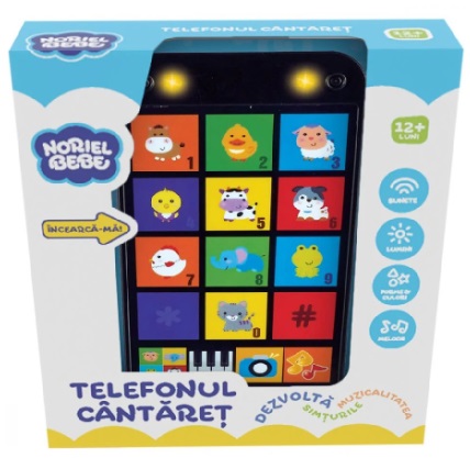 Noriel INT4173 Noriel Bebe - Telefonul Cantaret Virsta: 1+ Pentru: Ambisex Noriel Bebe "Telefonul cantare?" Alo, cine-i acolo? E telefonul cantare?! ?tie sa cante, sa lumineze, sa faca sunete de animale ?i multe altele. Dezvolta sim?urile ?i muzicaliatea. Func?ioneaza cu 2 baterii tip AAA (incluse). Varsta recomandata: de la 12 luni Возраст: 1+ Для: Всех Нориэль Бебе "Поющий телефон" Привет, кто там? Это поющий телефон! Он может петь, светиться, издавать звуки животных и многое другое. Развивает чувства и музыкальность. Работает от 2-х батареек ААА (входят в комплект). Рекомендуемый возраст: от 12 месяцев