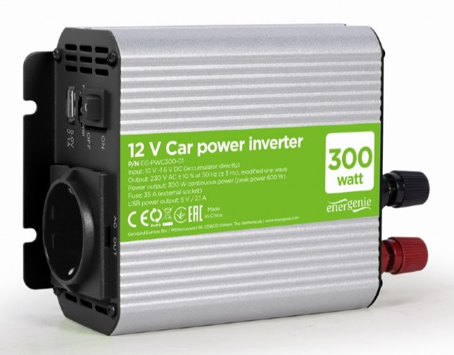 EnerGenie EG-PWC300-01, 12 V Car power inverter, 300 W, with USB port / 5V-2.1A, LED indicator, Input: 10-16 VDC (accumulator directly) - Output: 230 VAC +/- 10% at 50 Hz (+/-3Hz), modified sine wave Автомобильный инвертор 300 Ватт EG-PWC-032 подключается к напряжению в 12 вольт ЧИСТАЯ ЭНЕРГИЯ Источник питания 230 вольт в Вашем автомобиле Практичный USB-порт для зарядки мобильных устройств Источник переменного тока 220 В в Вашей машине: однорозеточный 300-ваттный инвертор Подходит для бытовой электроники с потреблением до 300 Ватт: ноутбуков, зарядных устройств телефонов, фотокамер, для пылесосов, электроинструментов и пр. Защита от перегрузок, короткого замыкания и встроенный вентилятор охлаждения обеспечивают надежное питание Вашим устройствам Светодиодная индикация Сменный плавкий предохранитель