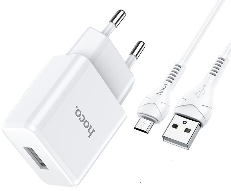 HOCO N9 Especial single port charger set Micro White Материал: огнеупорный PC. Выход: USB-A – 5V / 2.1A. EU штекер Размер: 76*37*23мм. Вес: 37г. Вес набора с кабелем: 51г. Набор с зарядным кабелем 1м.